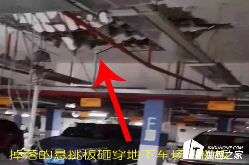如上圖所示,從樓房掉下的懸挑板直接砸向的地面。由于懸挑板重量大概有幾百斤,并且是從29樓高空墜落下來,因此把該小區(qū)的地下停車場的樓板直接砸穿了,由此可見該沖擊力以及危險性是有多高。如果當(dāng)初可以及時進(jìn)行全面的房屋檢測,并且早日發(fā)現(xiàn)異常并進(jìn)行加固處理,那么就不會導(dǎo)致此次安全隱患事件的發(fā)生,當(dāng)然這些都是馬后炮了。但在無形之中也提醒了我們,定期做好房屋檢測很有必要,未雨綢繆總歸不是什么壞事。